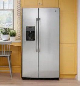 The GE GSS25GYPFS side-by-side refrigerator offers a spacious and convenient design. The fingerprint-resistant stainless steel finish looks great and is easy to clean. The interior offers bright LED lighting for easy visibility into every corner, and has flexible storage with adjustable, full-width spill-proof glass shelves and multi-level drawers for fruits and vegetables.