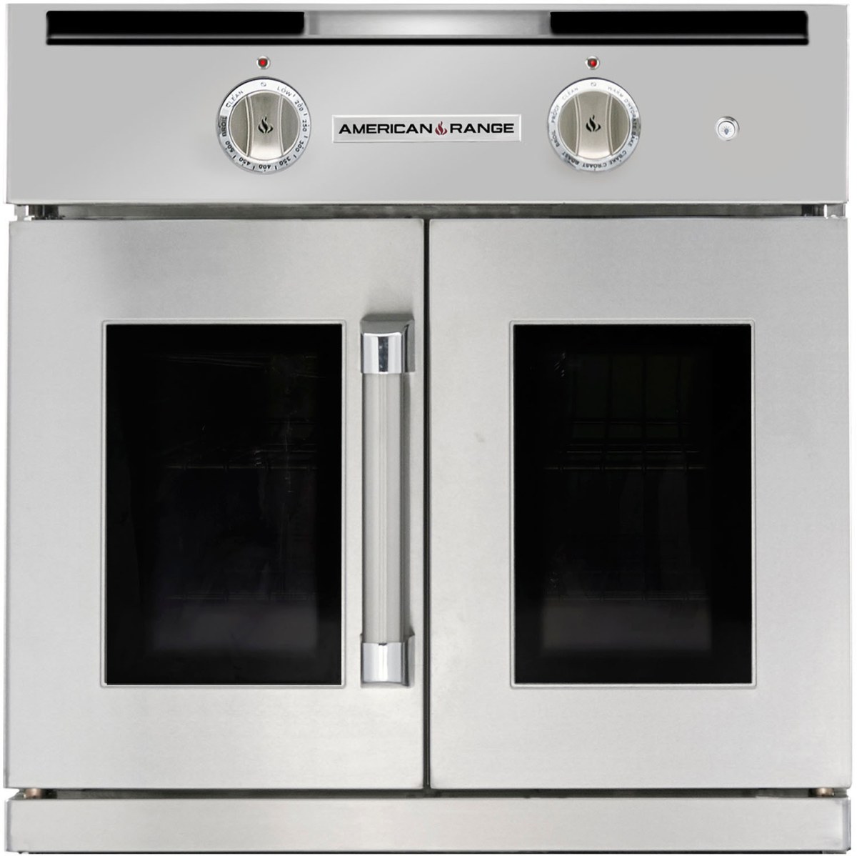Dependent French oven doors open 130° with the pull of one handle.