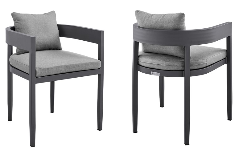This is a perfect set of chairs to use indoors and is treated to withstand being outdoors. Without having to worry about UV, rust, or weather damage, the Argiope chairs are ideal for your home, regardless of your location. The dark grey cushions are removable and feature a zipper closure, making cleanup a breeze! This outdoor furniture dining chair set features high-quality materials that come together gracefully for a look that is well-suited to your backyard, patio, pool area, garden, or screened-in porch. The lightweight and durable aluminum framework makes the Argiope outdoor chairs with cushions easily portable and features a multi-layer powder coating for further effective protection from the elements and everyday wear and tear. Featuring a modern and elegant design, these outdoor chairs remain a versatile addition to any setting. These patio dining chairs embrace a barrel silhouette to wrap you in comfort. The Argiope outdoor dining chairs are sold as a set of 2 and can support up to 308 lbs per chair.