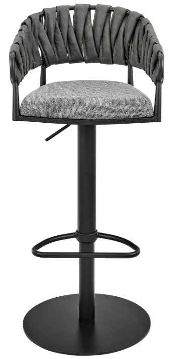 Make a chic style statement with our Blaise adjustable counter and bar stool in grey fabric, faux leather, and black metal. Faux leather straps are artfully wrapped around its metallic frame. Faux leather does not crack easily and is stain resistant, does not fade easily and is also UV resistant.Read More