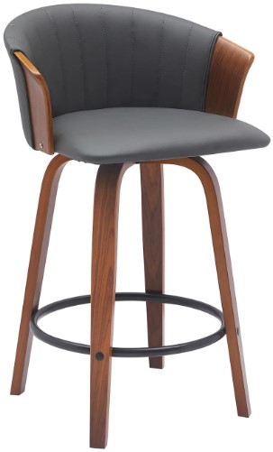Its graceful curves are complemented by bentwood legs and a metal ring that acts as a footrest for added comfort and functionality. Finished off with a padded seat and stunning tufting detail on the back, our counter stool allows you to enjoy meals and conversations at a bar or high-dining table with style and comfort. It is available in both faux leather and fabric upholstery to provide an easy-care material for your home. This wood bar stool features a modern and versatile design ideal for your kitchen island, pub table, home bar, or adjustable desk. With durable and sturdy construction, our bar stool can be used anywhere from a kitchen to a home office. It is fitted with a wonderful 360-degree swivel function with a smooth gliding system, allowing you to change direction and follow conversations with ultimate ease. The Diana swivel bar or counter stool easily incorporates into any home and is available in your choice of 26-inch or 30-inch seat height in a walnut wood finish with gray, cream, and black faux leather upholstery, and black wood finish with gray faux leather and light gray fabric upholstery.