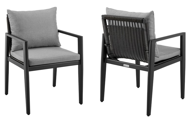 The cushions also feature a zipper closure that allows for easy removal and cleaning! Featuring an inviting and versatile design, these dining chairs sit easily in any backyard, patio, pool area, garden, or screened-in porch. Made up of a lightweight and durable aluminum framework, the Grand outdoor chairs with cushions are easily portable and feature a multi-layer powder coating for further effective protection from the elements and everyday wear and tear. These beautiful metal and wicker patio furniture pieces include plush dark grey high-density foam cushions to offer a cozy sitting experience and strong aluminum arms for added comfort. Without having to worry about UV, rust, or weather damage, the Grand chairs are the ideal choice of outdoor patio furniture for your home, regardless of your location. Constructed from durable materials, the Grand patio dining chairs allow for an easy and hassle-free setup all year round and will quickly become your favorite piece of outdoor furniture. The Grand dining chairs have a seat height of 19 inches, are sold as a set of 2, and feature a beautiful black powder-coated finish, dark grey cushions and support up to 308 lbs per seat.