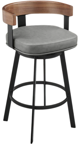 A refined barrel back envelopes your body, and the thick, high-density cushion offers extraordinary support. The generously padded seat is wrapped with luxurious faux leather to offer a premium seating experience. Perched upon tapered metal legs, our barstool ensures strength and long-lasting enjoyment anywhere from your kitchen to your home office. It lends a sophisticated touch to your kitchen island, pub table, home bar, or adjustable desk. The stool includes a built-in circular footrest, and its smooth,360-degree swivel function enables you to change direction with ease and engage with everyone around you. The Idris Swivel Counter and Bar Height Stool is available with a matte black iron base with a Walnut finish accent and Vintage Gray or Vintage Black faux leather upholstery.
