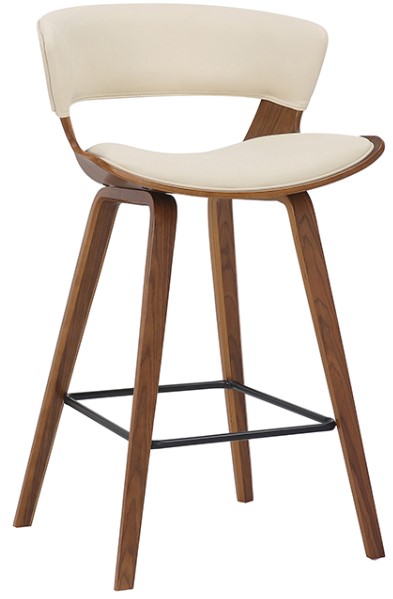 The smooth shape and clean lines of the Jagger Counter stool are accompanied by soft, sleek faux leather upholstery. The Jagger counter height bar stool is crafted with durable wood construction and incorporates a convenient square footrest for extra support. The Jagger is available in your choice of cream or brown faux leather with walnut wood finish or grey faux leather with a black brushed wood finish. Excellent choice for a contemporary dining setting.