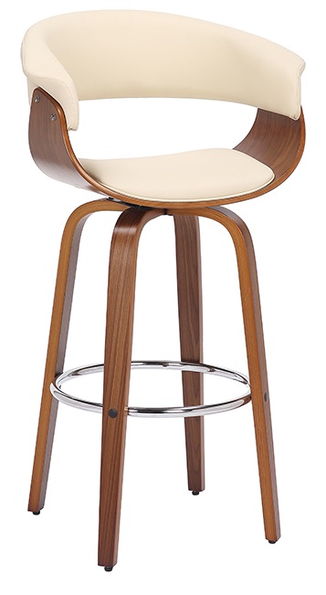 The high-density foam cushioned back, and seat allow you to sit or entertain comfortably. This stool features a full 360-degree swivel function that allows full mobility where you to interact with your guests and family regardless of your position in the room! Add the Julyssa to your kitchen, dining area, or home bar. The mid-century modern style silhouette of this stool creates a timeless look that will last for many years to come. The Julyssa is available in your choice of a Walnut Wood finish with Brown or Cream faux leather upholstery or a Black Wood finish with Grey faux leather upholstery and your choice of a 26” or 30” seat height.