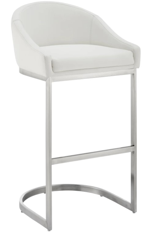 Offers outstanding support, and delivers a contemporary silhouette. This metal bar stool is upholstered in faux leather. Faux leather is stain resistant and it's also UV resistant. This modern bar stool is ideal for your kitchen island, pub table, home bar, or adjustable desk. Use universally in your home from your kitchen to your home office and allow its versatility to shine. The Katherine barstool is available in a counter or bar seat height and comes in a brushed stainless steel finish with black, grey, or white faux leather upholstery or a black finish with black or grey faux leather upholstery.