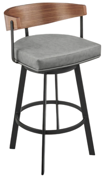 The chic and refined barrel back embraces your body, and the generously padded seat is packed with extra firm foam to offer support for years to come. The cushion is upholstered in sumptuous faux leather that resists cracking and is water and stain-resistant for easy care and maintenance. Elevated by four sturdy, metal legs, this stool invites lasting comfort and elegance anywhere from your kitchen island, pub table, home bar, or even a standing desk in your home office for a stylish impact. This bar or counter stool includes a built-in footrest to relieve pressure on your legs and lower back to ensure you and your guests are comfortable for hours. The Lacey Swivel Counter and Bar Height Stool is available with a matte black iron base with a Walnut finish accent and Vintage Gray or Vintage Black faux leather upholstery.