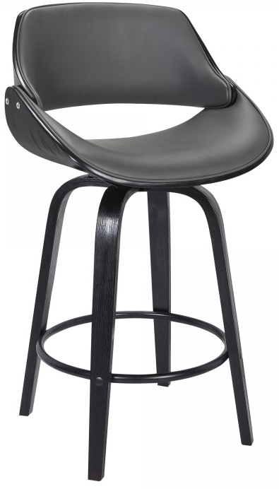 The beautiful frame is constructed from elegant Black Brushwood and complimented by the inclusion of a convenient Black Powder Coat finished ring footrest. The aforementioned bucket seat of the Mona features foam padding and sleek Grey Faux Leather upholstery. The stool's low back offers exceptional lumbar support while the 360-degree swivel action allows for optimal user mobility while seated. The impressive Mona barstool is available in 2 industry standard sizes; a 26 inch counter and a 30-inch bar height. Also available in a walnut wood finish with a chrome-finished footrest.