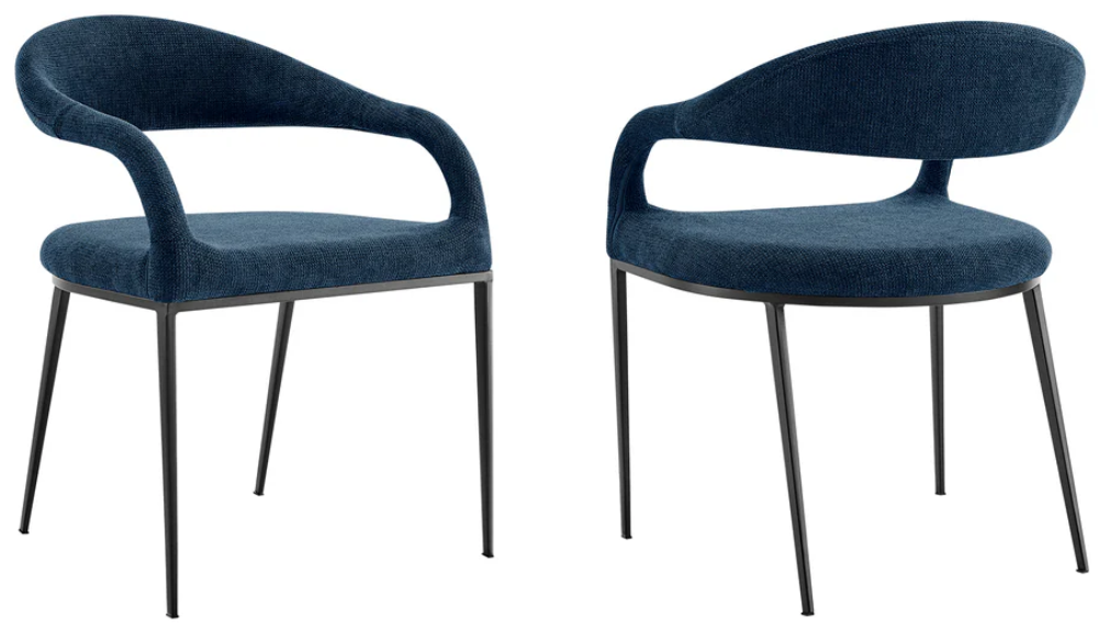 Its beautifully curved back and seamlessly flowing arms lend refinement to this dining chair and any room you put it in. The back, arms, and seat cushion are fully upholstered to offer hours of comfort. The Morgan chair is covered in performance fabric, which provides easy care and maintenance. Perched om four slender legs, this dining chair serves as a stylish complement to any contemporary or modern room. From casual to formal meals, elevate your eat-in kitchens and dining rooms to the simple elegance of the Morgan Dining Chair. Beyond dining, it can offer a chic and comfortable accent chair anywhere from your living space to your home office. Available as a set of two, the Morgan Upholstered Dining Chair comes in matte black iron with Light Gray, Charcoal, or Blue Fabric, or brushed stainless steel with Light Gray, Charcoal, or Blue Fabric to bring comfort and grace to your home.