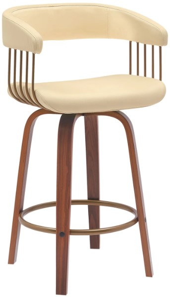 Its hugging barrel back and contoured seat is generously padded to offer sink-in comfort. Complemented with sculptural bentwood legs and a metal footrest, our bar stool blends eye-catching style with a dose of comfort and functionality. It is upholstered in faux leather which does not crack or fade easily; the material is both stain and UV resistant for easy maintenance and longevity. Expertly crafted from engineered wood and metal, our contemporary bar stool remains a rich blend of materials and finishes, bringing luxury and sophistication anywhere from your kitchen to a home office. It remains the perfect complement to a kitchen island, pub table, home bar, or adjustable desk. For supreme functionality, the counter stool is fitted with a wonderful 360-degree swivel function, allowing you to join conversations and work with efficiency and ease. The Topanga swivel bar or counter stool easily incorporates into any home and is available in your choice of 26-inch or 30.5 -inch seat height in a walnut wood and Golden Bronze finish with cream or gray faux leather, or a black and Golden Bronze finish with your choice of gray or black faux leather upholstery.