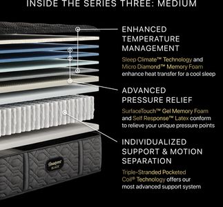 Experience the best of Beautyrest®, featuring advanced temperature management technology, Micro Diamond™ Memory Foam, and advanced, Triple-Stranded Pocketed Coil® Technology for conforming support and motion separation. Self-Response™ Latex offers a specialized upgrade for responsive pressure relief, as it contours to relieve your body’s unique pressure points while maximizing airflow for cool sleep every night.Read More
