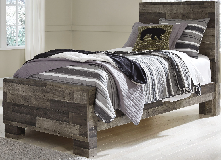Modern yet hefty. This twin panel bed makes an urban eclectic statement. Seasoned raw wood look merges with the clean lined design we love today. Muted rustic finish over replicated pine grain maintains its authenticity for a beauteous look.Read More
