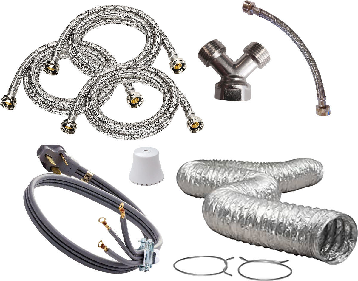 Includes 3 Stainless Steel Braided Washer Hoses, 1 Y Connector, 1 Extender Hose, 1 Metal Dryer Vent, Dryer Cord, 2 Vent Hose Clamps, and Flood Buzz Leak Detection Sensor.Read More