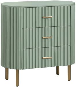 Soft sage goes sculptural. Vertical flute grooves wrap this demi-oval chest, creating subtle shadow play while slim brass legs lighten the footprint. Three smooth-glide drawers hide linens, tech or toys—ideal for hallways, nurseries or chic home offices.Read More