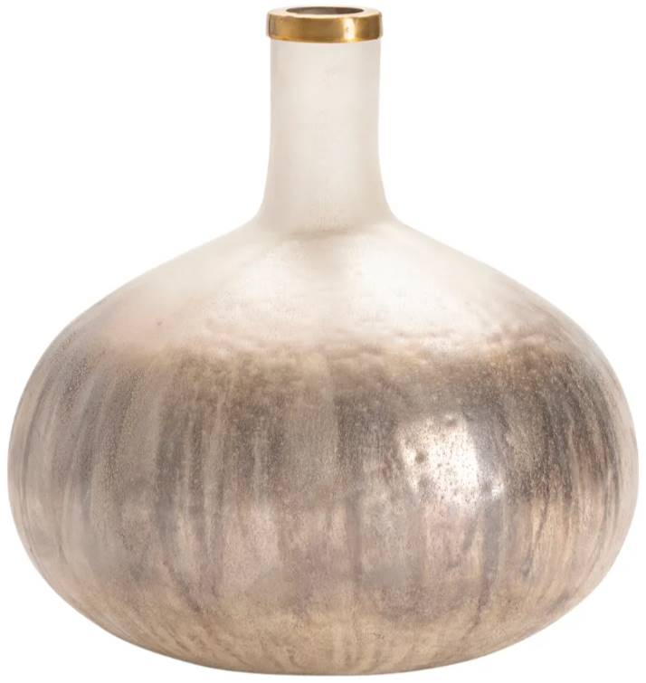 It is made from glass and has a golden glow from within the bulbous base, then changes to a frosted glass and culminates with a shining gold ring around the opening at the top. This vase will look beautiful in your transitional style home decor.Read More