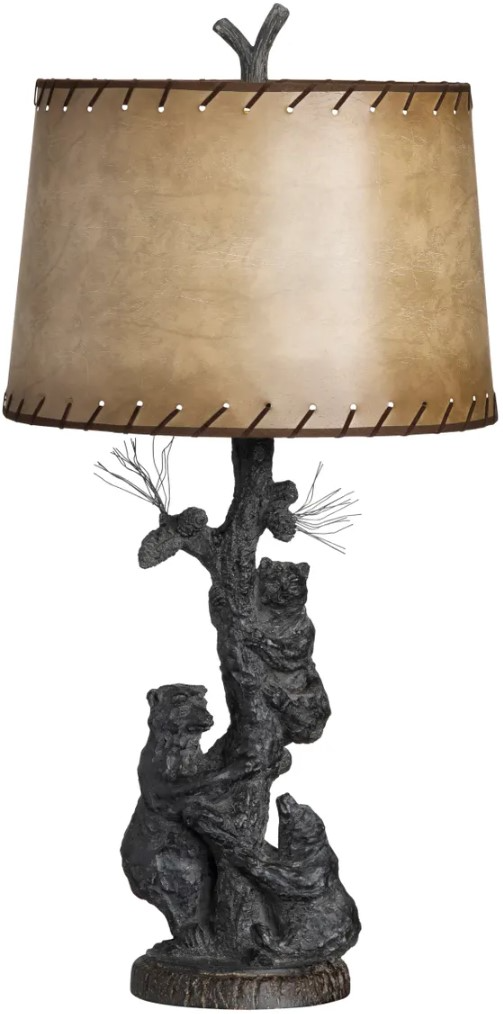 The Crestview Collection Bear Family Table Lamp has three bears frolicking together as they climb up the pine tree base. The shade is made to look like stretched and tanned leather with hand stitching at the top and bottom of the shade.Read More