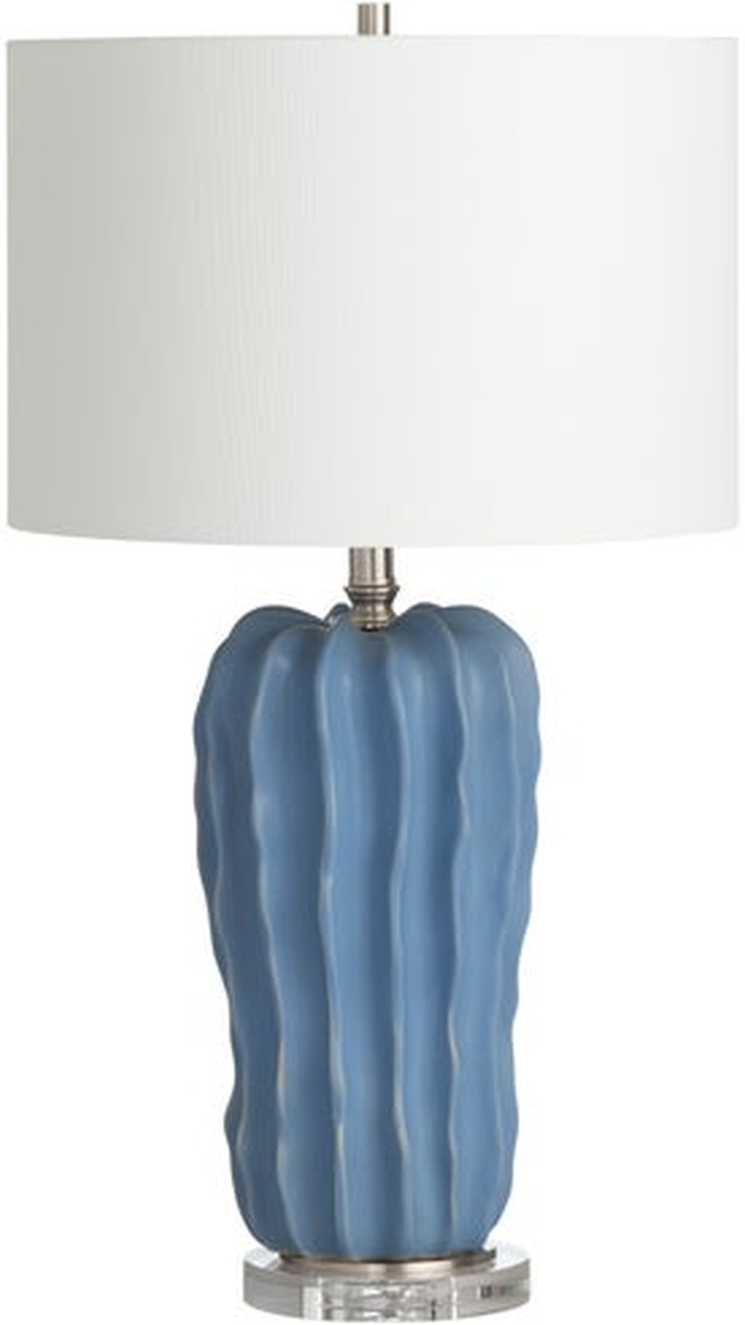 The Dora Table Lamp features a ceramic and crystal base, blue stone finish, and a white linen drum shade.Read More