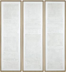 The Crestview Collection Emery piece includes three tall, narrow images that complement one another. These textured pieces are created from hand painting over burlap. A thin, gold frame accents the white design of the artwork. Each transitional image measures 21.6-inches x 71.6-inches and hangs with included D-ring hardware pieces.Read More