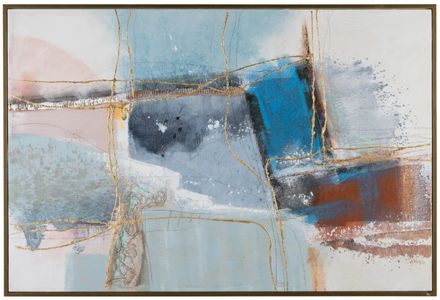 The Crestview Collection Halu Framed Mixed Media on Stretched Canvas is an abstract in the modern style. With neutral shades of blue and brown highlighted with gold the canvas is framed with a narrow gold-tone frame.Read More
