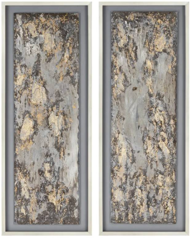 The Crestview Collection Heavy Metal framed painting on metal in a set of two features elegant tones of silver, bronze and gold. Measuring 22.5-inches x 58.5-inches, this modern style art features intricate parallel paint strokes that enhance the discerning look of this set of paintings.Read More
