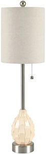 The simplistic Crestview Collection Meyer Buffet lamp features a brushed nickel stem extending from a unique cream-colored ceramic element. It has a slender cylinder shade and a functional single pull.Read More