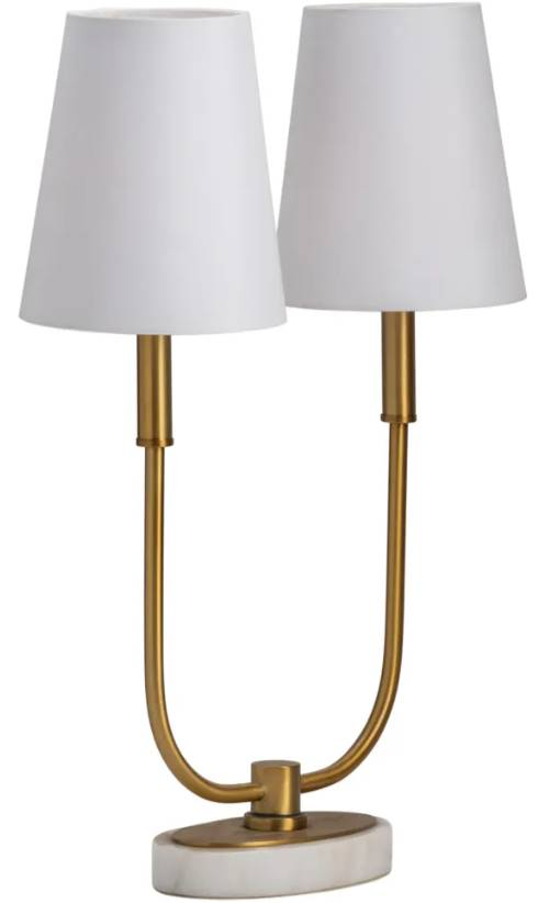 The Crestview Collection Hale Double Light Task Lamp features a U-shaped antique brass body sitting atop a marble base. Each end of the U supports a small, white tapered shade and light. Control the two lights independently for a soft brightness, or turn on both to really brighten up your room.Read More