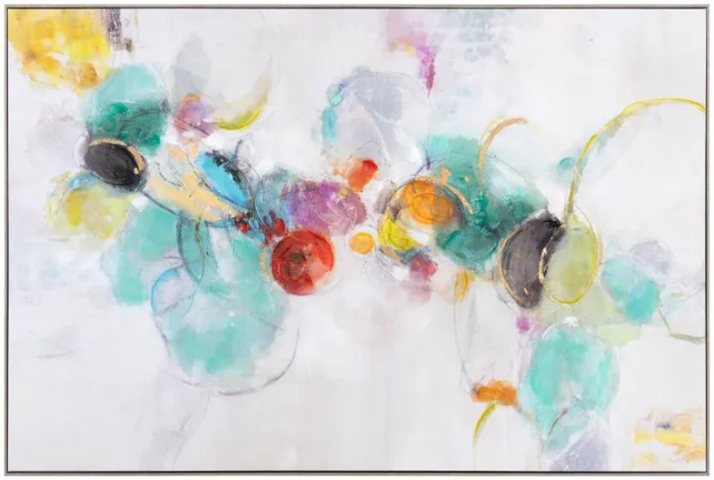 The clean white background provides a perfect backdrop for the colorful circles, creating a beautiful contrast that is both eye-catching and refreshing. Measuring 60x40", this painting is the perfect size for adding a pop of color to any space. It's ideal for brightening up a living room, bedroom, or playroom, and is sure to be loved by adults and children alike. The painting features gold foil embellishments, adding a touch of glamour and elegance to the overall design. The foil adds an extra layer of depth and texture, making the painting even more visually appealing. It comes professionally framed in a sleek silver frame to finish the look.
