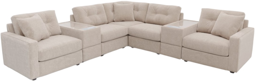 Includes right arm chair, left arm chair, 2 electronic storage consoles, corner wedge and 2 armless chairs