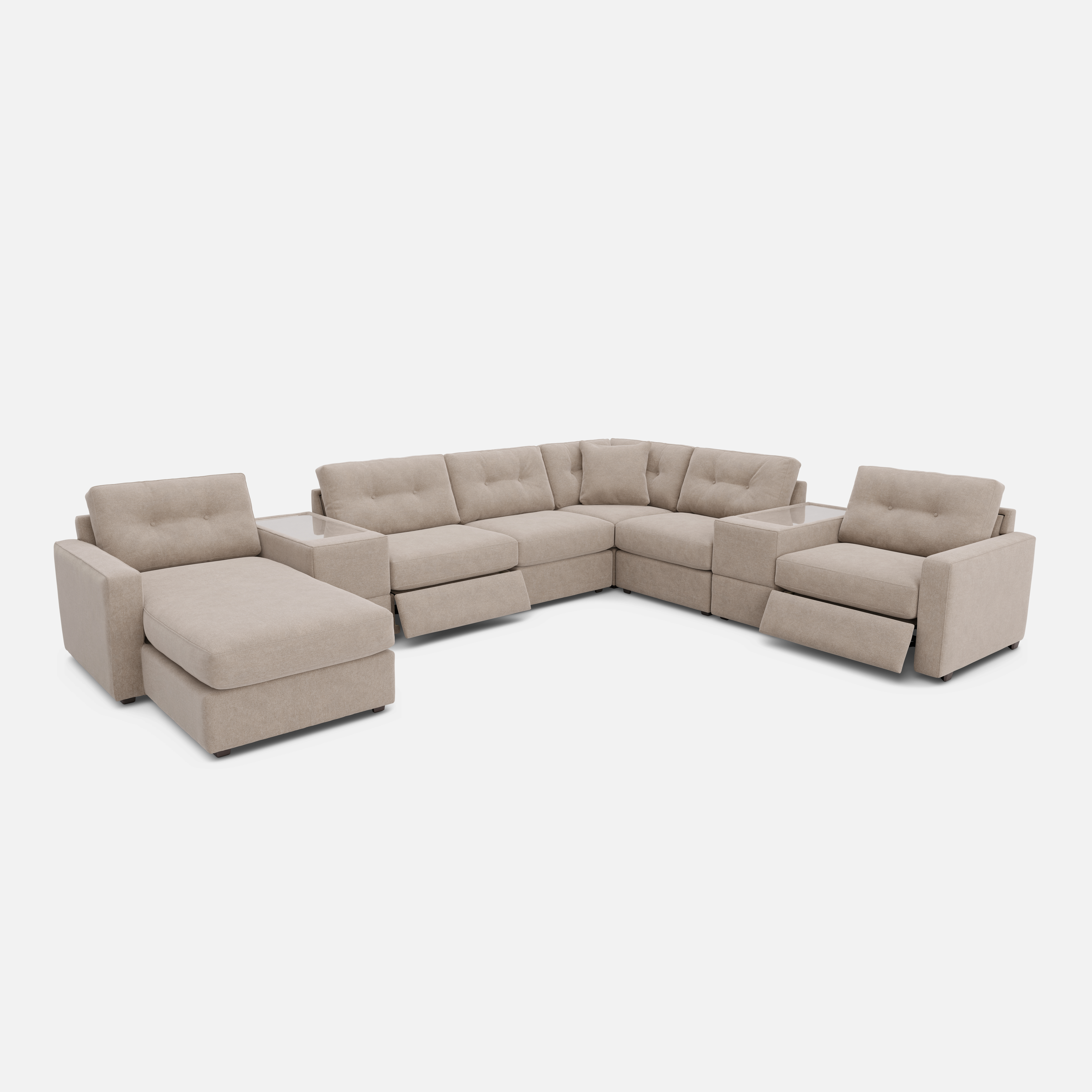 Includes includes right arm power recliner, left arm chaise, 2 electronic storage consoles, corner wedge and 2 armless chairs, 1 armless power recliner