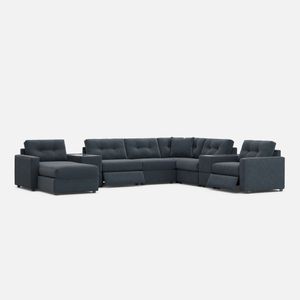 Includes includes right arm power recliner, left arm chaise, 2 electronic storage consoles, corner wedge and 2 armless chairs, 1 armless power recliner