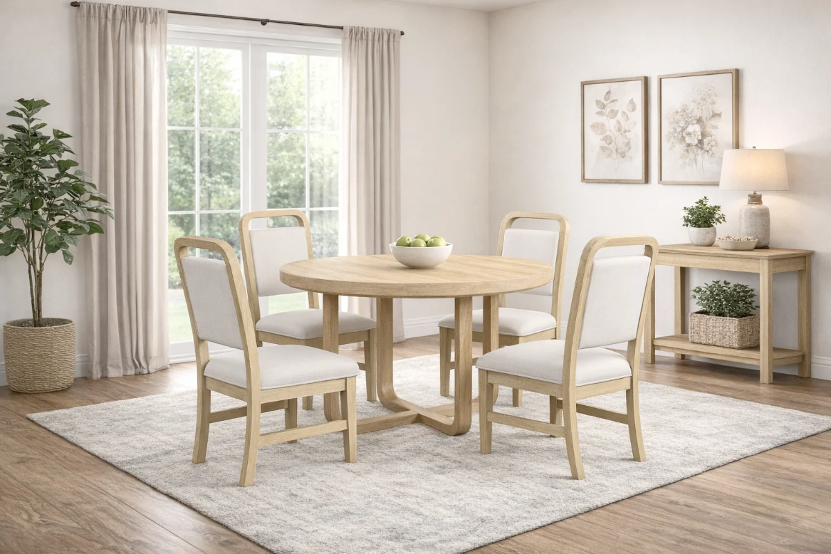 Gather in effortless charm around the Ridgemont 5-Piece Dining Set, where natural beauty meets cozy elegance. The round table, crafted with a warm natural finish, invites meaningful conversations and shared laughter, creating a welcoming focal point for your dining space.Read More