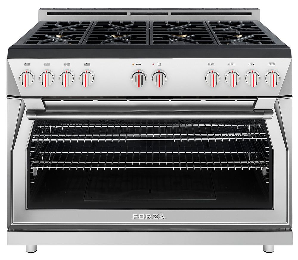 The Forza 48-inch Professional Gas Range is the world’s first 48-inch single cavity oven. Spanning 40-inches wide, it is radically designed with 8 high-powered burners including four dual-flame burners that range from 685 BTU to 20,000 BTU and four from 2,200 to 12,000 BTU burners.Read More