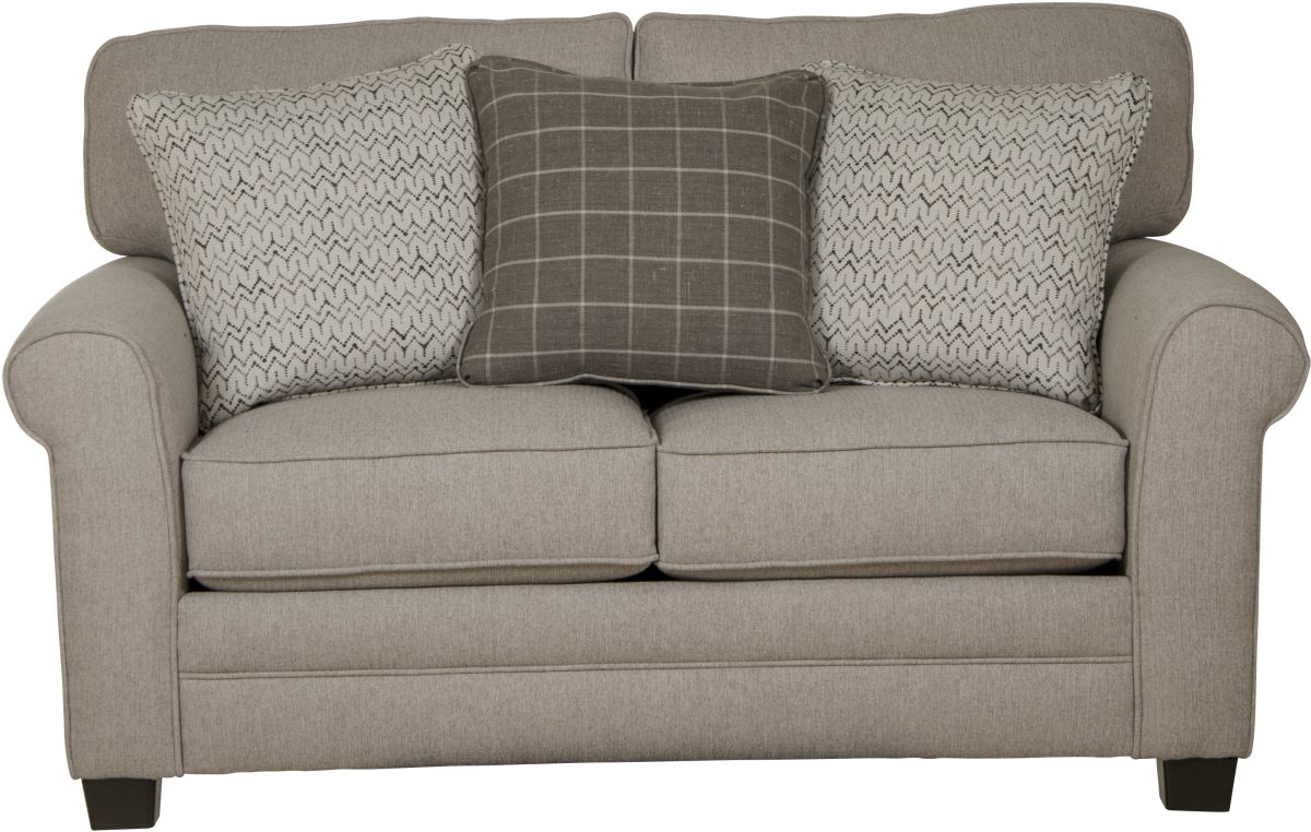 Lewiston loveseat has rolled arms and block feet. 3 throw pillows included. Farmhouse design.