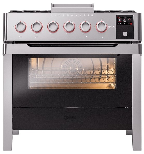 The Panoramagic 36" dual fuel range is a top-of-the-line appliance that combines cutting-edge technology with Italian culture design to the kitchen. This range feature 6 gas burners and a griddle, equipped with total black brass burners that has a non-stick nanotechnological coating.Read More