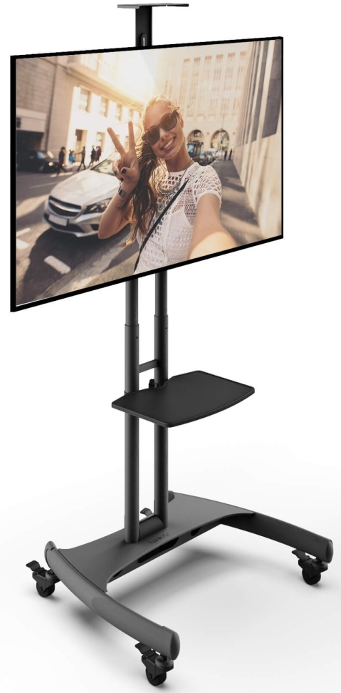 The MTM65PL provides a safe way of maneuvering your TV around any home or office setting. Its steel frame is quick to assemble and features 2-inch rubber casters to smoothly roll it between locations. Along with a top shelf suitable for a webcam, this rolling TV stand includes a height-adjustable plastic tray to conveniently carry your laptop, PVR, or other digital devices. Its telescopic center columns offer 16 inches of height adjustment and feature integrated cable management for an exceptionally tidy setup. To ensure your TV and accessories remain secure, each wheel includes a quick-release lock that can be easily applied and released with your foot.