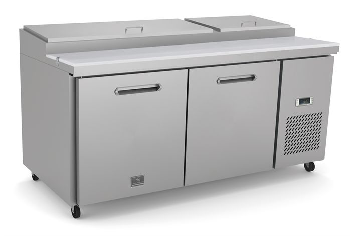 Built to endure rigorous use, the Kelvinator Commercial refrigerated pizza table is made of aluminum, galvanized steel, and stainless steel—rust-resistant, simple-to-clean metals. This table is positioned on heavy-duty casters to assist in relocation. The Kelvinator Commercial pizza prep table's stainless steel workspace features a full-depth cutting board and three built-in ingredient compartments that can accommodate 12 third-size pans.Read More