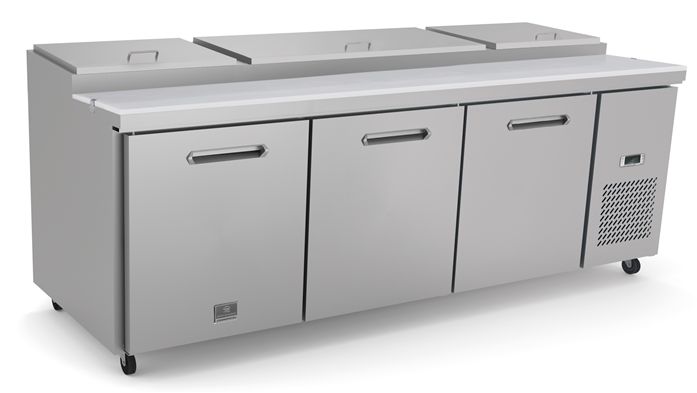 Built to endure rigorous use, the Kelvinator Commercial refrigerated pizza table is made of aluminum, galvanized steel, and stainless steel—rust-resistant, simple-to-clean metals. This table is positioned on heavy-duty casters to assist in relocation. The Kelvinator Commercial pizza prep table's stainless steel workspace features a full-depth cutting board and three built-in ingredient compartments that can accommodate 12 third-size pans.Read More