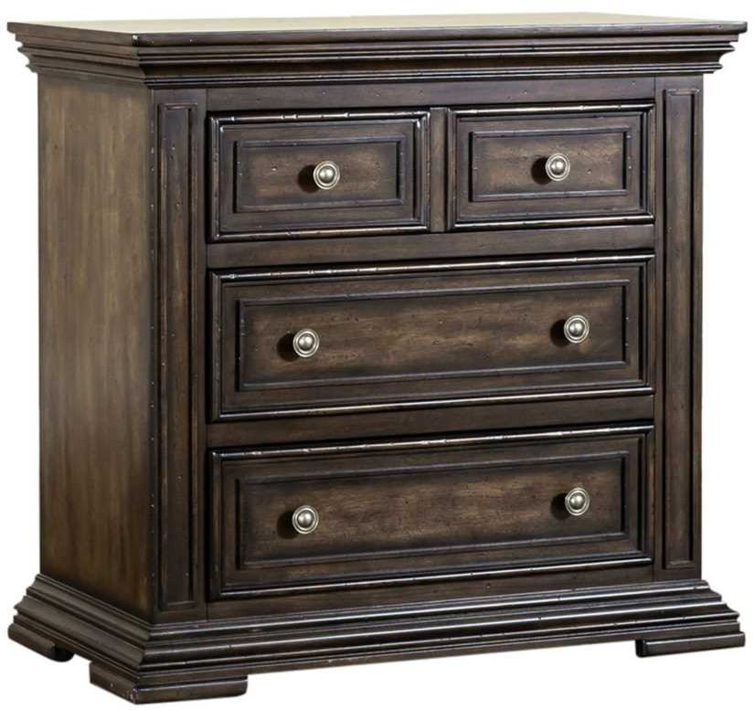 Incorporate this traditional, large scale bedside chest into your bedroom. The Brownstone finish features heavy distressing, characterized by warm and intricate details. Enjoy the convenience of having a built-in charging station in the back of the night stand, featuring two USB ports and two outlets.Read More