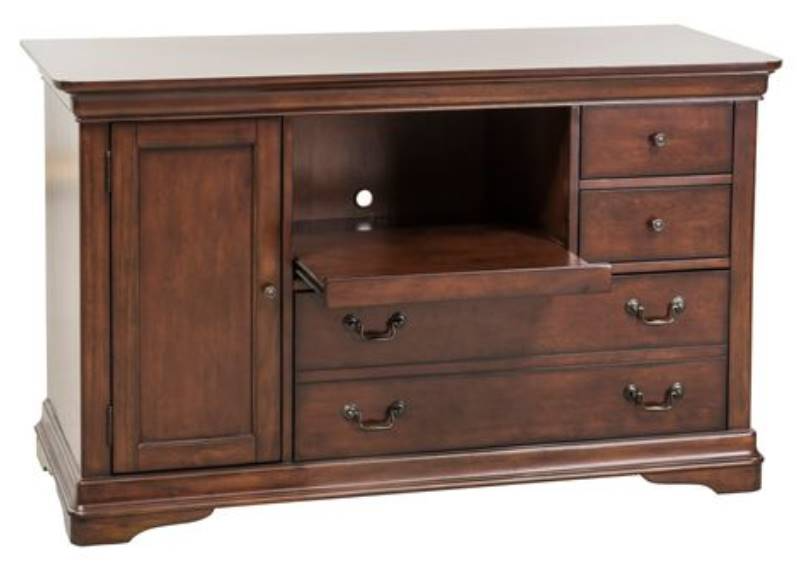 Turn any space into a home office with the Brookview credenza. Crafted with poplar solids with cherry and birch veneers, this piece features a rustic cherry finish, fully stained full extension drawers, a lateral file drawer, pull-out printer shelf, and a removeable/adjustable shelf, accented by antique brass bail hardware.Read More