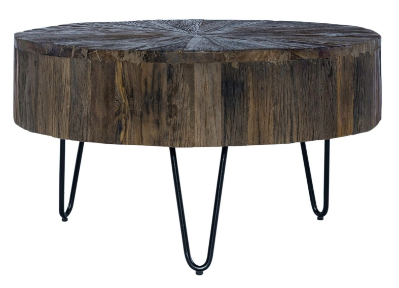 Canyon accent cocktail table makes a bold statement to any room. Crafted of solid reclaimed mango with powder coated black hairpin metal leg for years of durability. Finished in a railroad brown finish sure to complement any living room suite. Versatile enough to use in a downtown city loft or country home.Read More