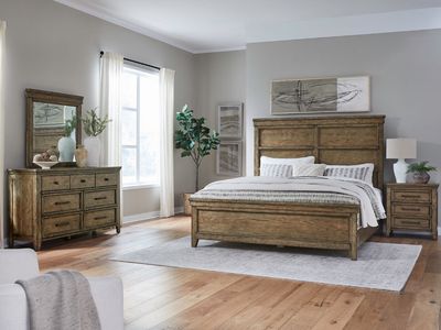 Sleep with ease with the carolina park king panel bed, dresser, mirror, and nightstand. Crafted with excellence using rubberwood solids and split heart white oak veneers, this set features an amber brown finish. With wide pilasters featuring a softly shaped cap rail, the bed exudes a sense of timeless sophistication.Read More