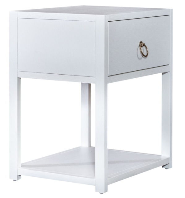 Turn your house into a home with the eclectic East End accent table. Crafted of Acacia Solids and veneers, this piece features a wire-brushed white finish accented with brass ring hardware. This piece offers one full extension drawer and an open bottom shelf for additional storage.Read More