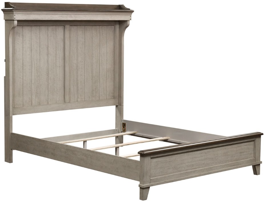 Create a relaxing retreat with the Ivy Hollow queen mantle bed. Crafted of poplar solids with pine and alder veneers, this bed features a heavily distressed weathered linen and dusty taupe finish with saw marks. The headboard has a shaped mantle crown with a gallery top and touch LED lighting illuminating planked panels.Read More