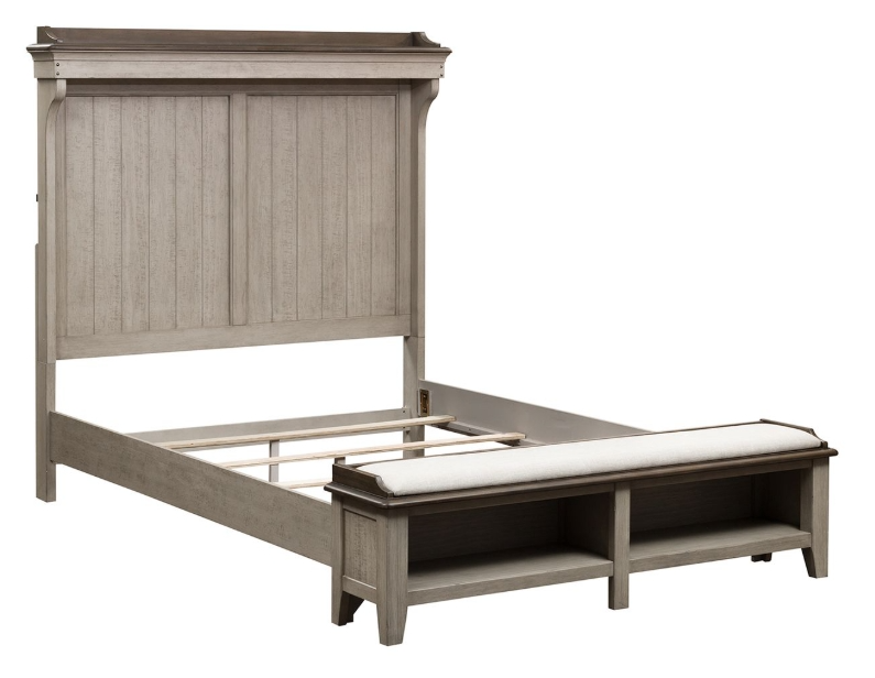 Create a relaxing retreat with the Ivy Hollow queen mantle storage bed. Crafted of poplar solids with pine and alder veneers, this bed features a heavily distressed weathered linen and dusty taupe finish with saw marks. The headboard has a shaped mantle crown with a gallery top and touch LED lighting illuminating planked panels.Read More