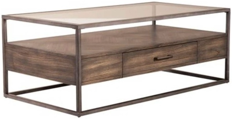 Simplify your urban space with the Jamestown rectangular cocktail table. Crafted of rubberwood solids, metal tubes and mindy veneers, this piece features a tobacco finish, one full extension drawer, an open shelf for additional storage, and an appealing beveled glass top. This modern cocktail table would make a great addition to your contemporary space.Read More