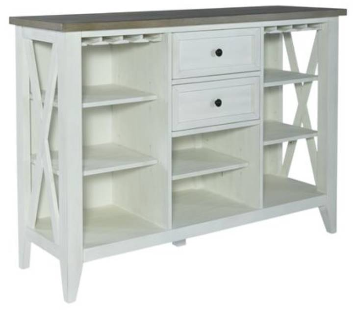 Accent your space with the Lakeshore server in white. Crafted of rubberwood solids with pine veneers, this piece features a two-toned white and wood finish, two fully stained full extension drawers for easy access to storage, X accents on the end panels, stemware storage.Read More