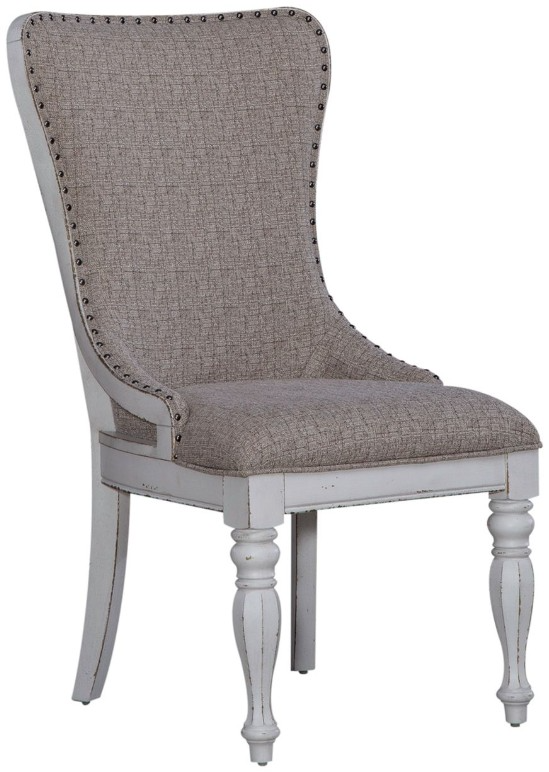 Sit in comfort and style with the Magnolia Manor upholstered wing back side chair. Crafted with excellence using rubberwood solids, this chair features a heavily distressed antique white base with ivory tweed chenille upholstery. The chair has an alluring flared cap rail and gently sloping arms for a classic timeless design.Read More