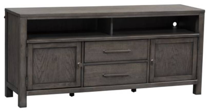 Accent your living room with the perfect farmhouse design, using this unique and stylish 66" tv console. Crafted of poplar solids with knotty white oak veneers, this piece accommodates most 72" TVs and features sound bar storage, planked tops, adjustable shelving, block pilaster.Read More