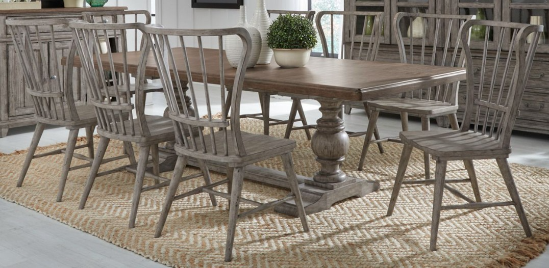 Crafted with Pine solids and veneers, this set features a heavily distressed Riverstone Grey and Tobacco finish and includes the trestle table and six Windsor back side chairs. The trestle table includes a removable and self-storing leaf on an easy glide leaf track system for easy expansion. The tabletop has softly rounded edges and stop molding. Two heavy turned round pedestals flow to shaped bracket feet and a center trestle. The chairs feature a softly shaped wing style Windsor back that cradles the body and a saddle shaped wooden seat for added comfort.