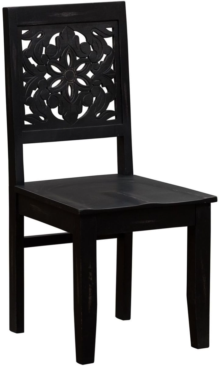 The Boho inspired Trellis Lane accent chair will make your room both functional and stylish. Crafted of solid mango in a Weathered Black finish with brown rub thru. Features artisan hand carved chair back, saddle shaped seat, and blocked tapered legs. Add the accent writing desk and bookcase to complete your look.Read More